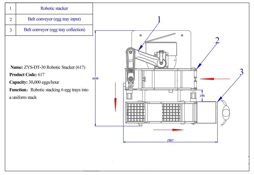 The ZENYER 617 robotic egg tray stacking system is an automated solution designed to integrate seamlessly with egg farm packers, consist of a robotic arm, two belt conveyors, an HMI touchscreen control panel and a safety net guard.