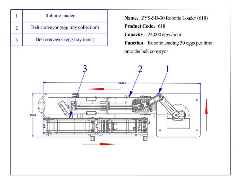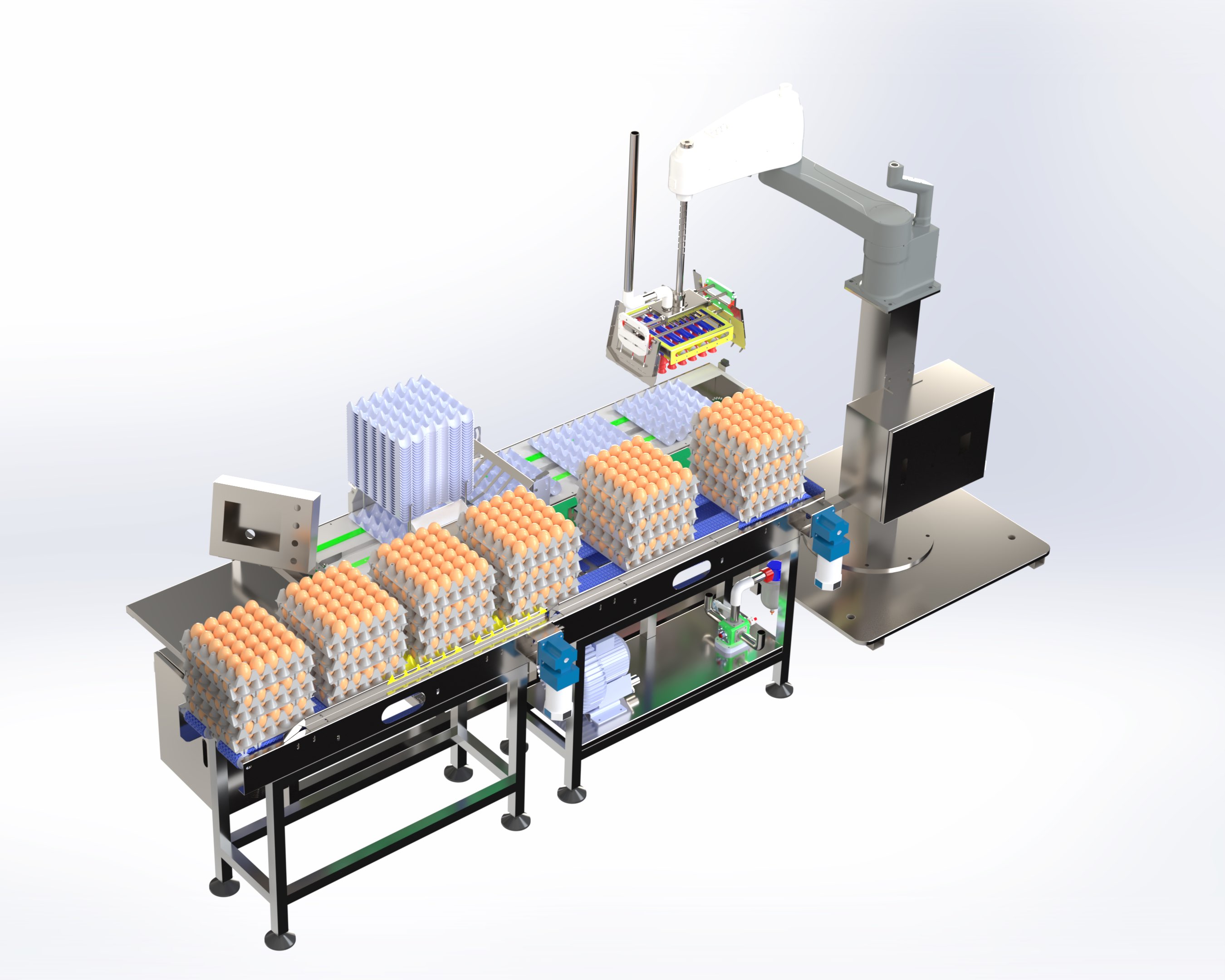 Function:Robotic loading 30 eggs per time onto the belt conveyor,Empty tray nesting