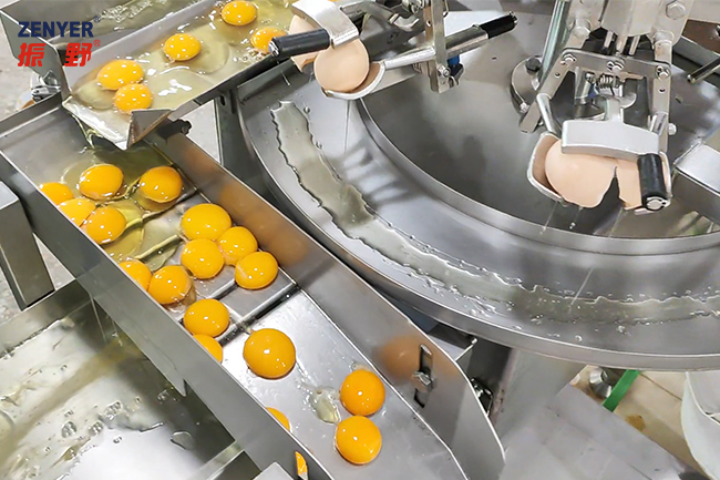 ZENYER 501A egg breaker is comprised of a feeding conveyor, the egg breaking station with 8 robotic arms with special knives and an egg yolk & white sepatating trough.