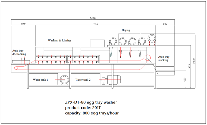 Is equipped 2 water tanks, one for egg tray washing, the other for rinsing, the water that is used to wash trays is recycled and used again, there's a filter above each tank that filter impurities to improve recycled water quality, you can add chemicals such as sanitizer or disinfectant(follow the policy of food authority in your area) into water tank to ensure the egg trays meet all the rules and standards for food processing.