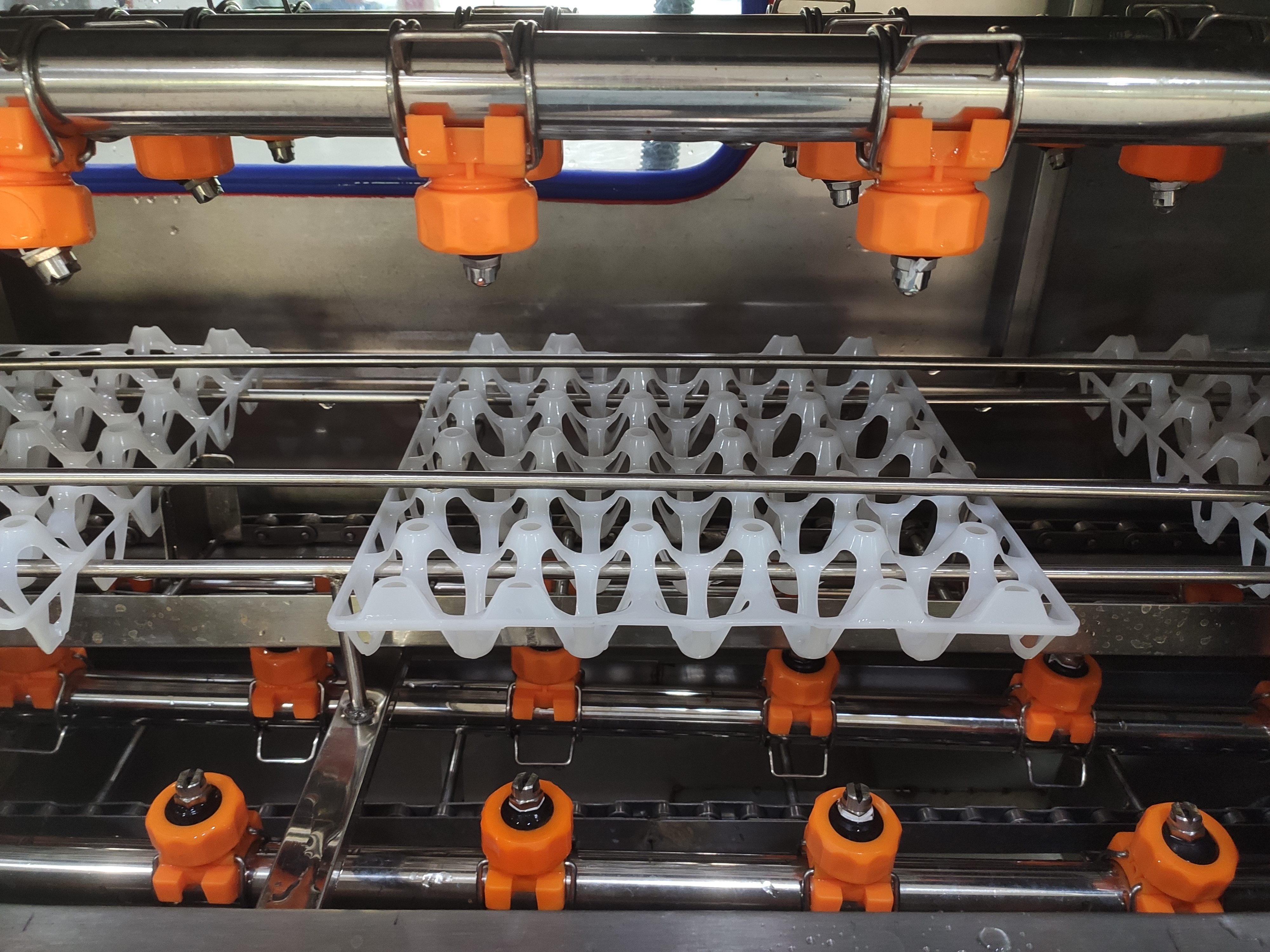 After rinsing, water on the plastic egg trays will be blown off by the drying system, if you want even better drying result and efficiency however, you can turn on the heater that comes with the machine.