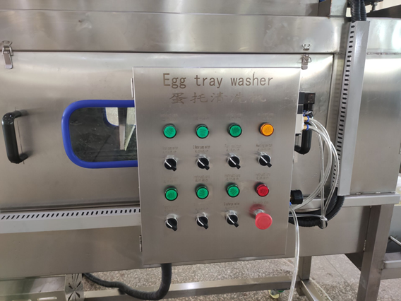 This model of plastic egg tray washer is featured with a control panel which you can turn on/off each function separately through the buttons on it.