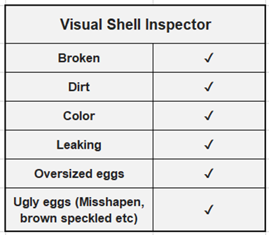 Software analyzes images in real time to identify defects, including cracked shells, leaks, dirt spots, misshapen eggs, off-color eggs, brown-speckled eggs, and other cosmetic defects.