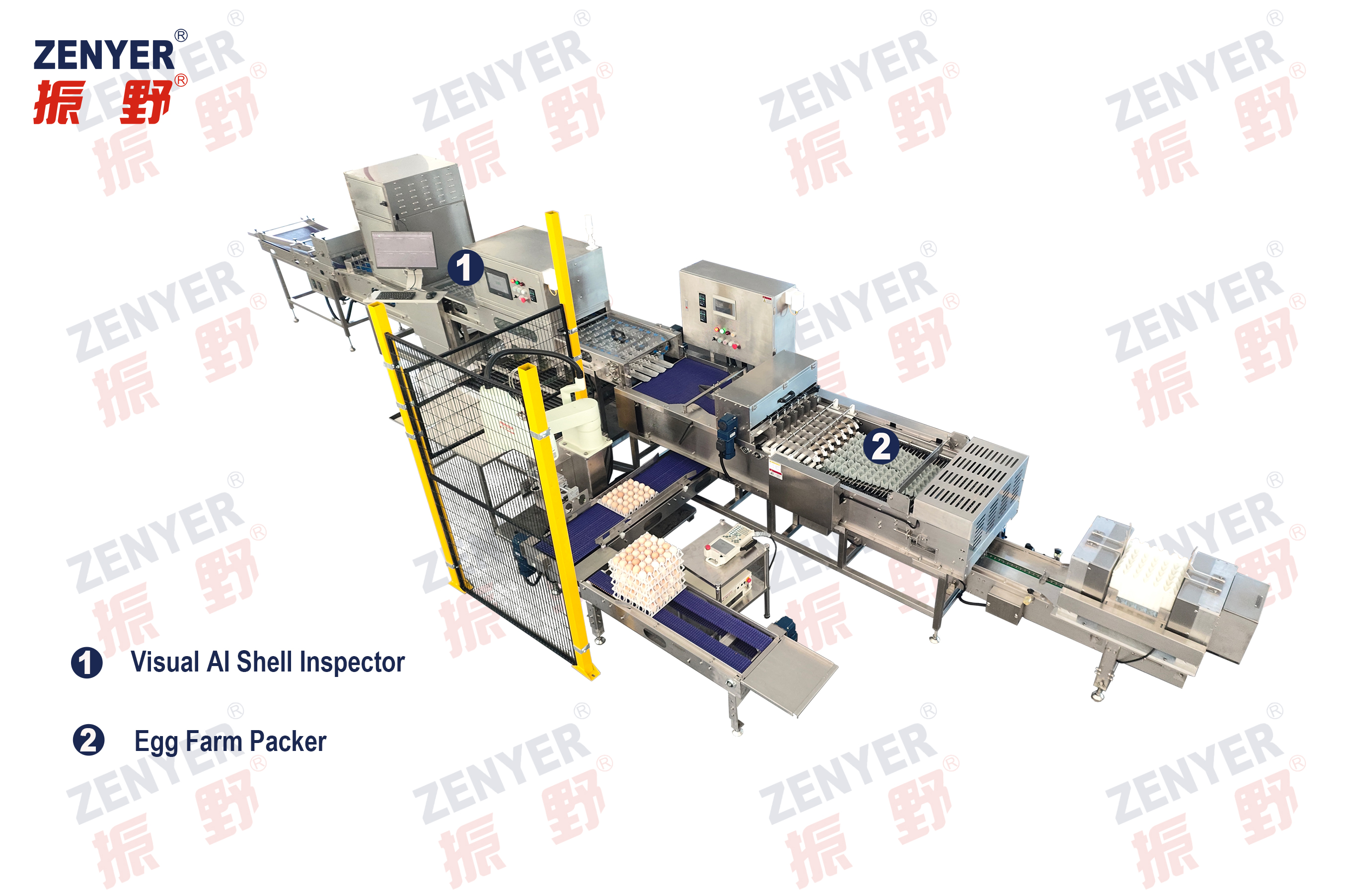 The ZENYER E-Farm Packer is a fully integrated egg processing system capable of processing up to 36,000 eggs per hour.It integrates state-of-the-art AI inspection technology and automated packing functions into one compact, streamlined system.