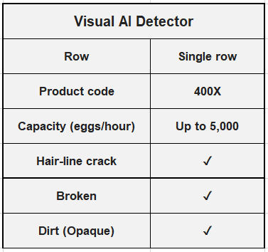 Uses artificial intelligence and image processing technology to accurately identify and remove hairline cracks and broken eggs from the production line, improving food safety and product quality.
