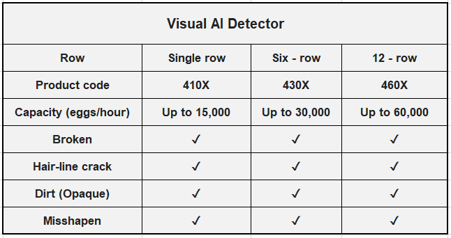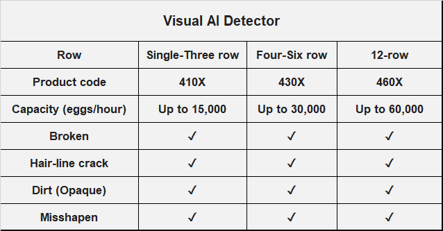 You can have the 6-row Visual AI detector to match with the 6-row of a new Zenyer egg washer or an egg grader with the capacity up to 30,000 eggs/hour.