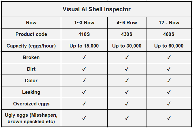 Defective eggs are automatically removed from the line. ZENYER 410S & 430S & 460S Visual AI Shell Inspector -Specific Features Capacity & Compatibility: 410S : Designed for single-row ZENYER egg washers or graders, processing up to 10,000 eggs/hour. 430S : Built for high-capacity systems, handling up to 30,000 eggs/hour. 460S : Built for high-capacity systems, handling up to 60,000 eggs/hour.