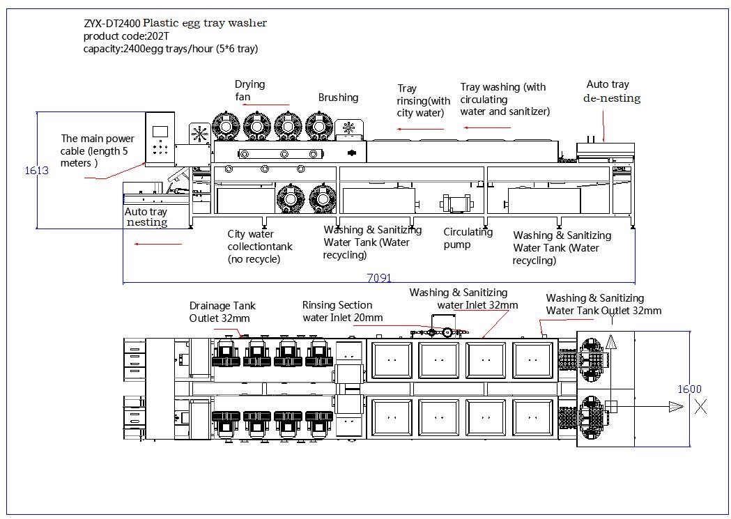 * Net weight and gross weight are for your reference only ZENYER 202T Plastic egg tray washer Floor plan Automatic egg tray de-nesting High pressure water for tray washing